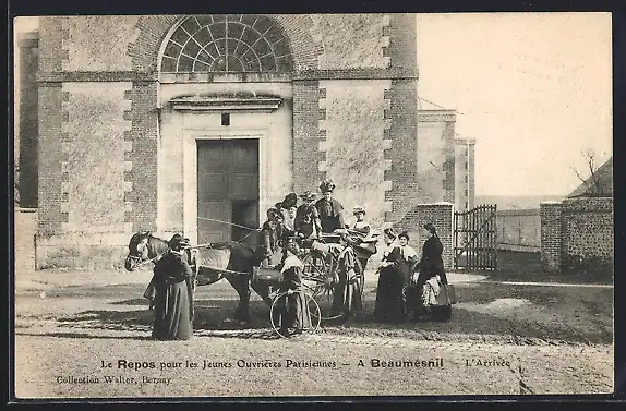 AK Beaumesnil, Arrivée des jeunes ouvrières parisiennes en calèche