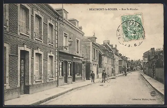 AK Beaumont-le-Roger, Rue St-Nicolas avec des passants et des bâtiments alignés