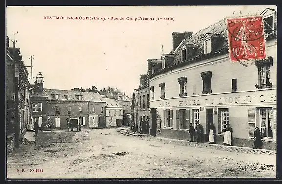 AK Beaumont-le-Roger, Rue du Camp Frémont avec le Lion d`Or