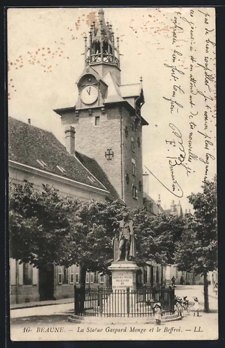 AK Beaune, La Statue Gaspard Monge et le Beffroi
