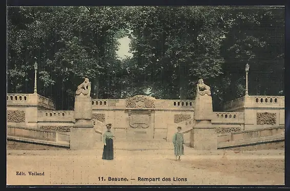 AK Beaune, Rempart des Lions avec des statues et des passants devant une forêt dense