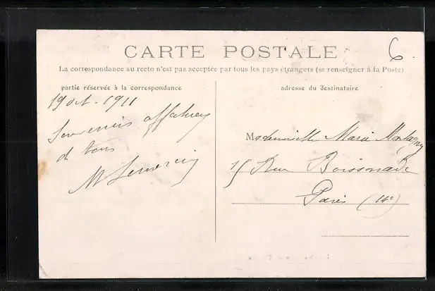 Personenbezogene Daten auf der Rückseite der Karte wurden durch blauen Textmarker unkenntlich gemacht. Die blauen Stellen sind auf die Vorderseite durchgeweicht und wirken sich negativ auf das Postkartenfoto aus