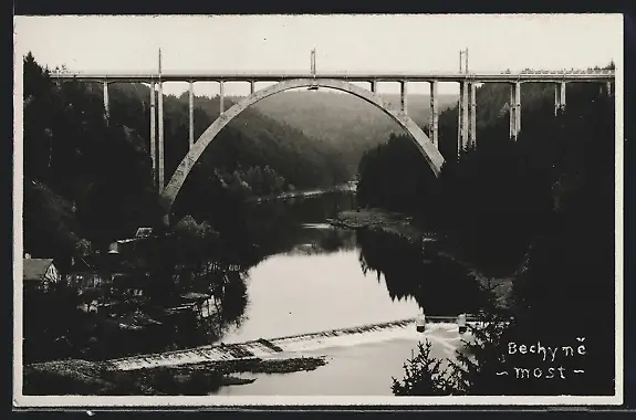 AK Bechyne, Blick auf die Brücke über den Fluss