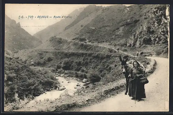 AK Bedous, Route d`Aydius, Frau mit Esel auf Bergstrasse entlang eines Flusses