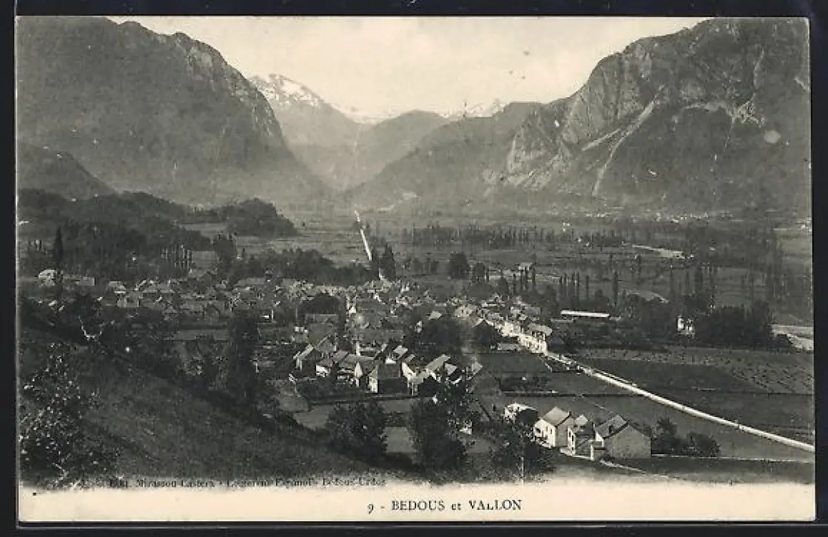 AK Bedous, Vue du village et du vallon entouré de montagnes majestueuses