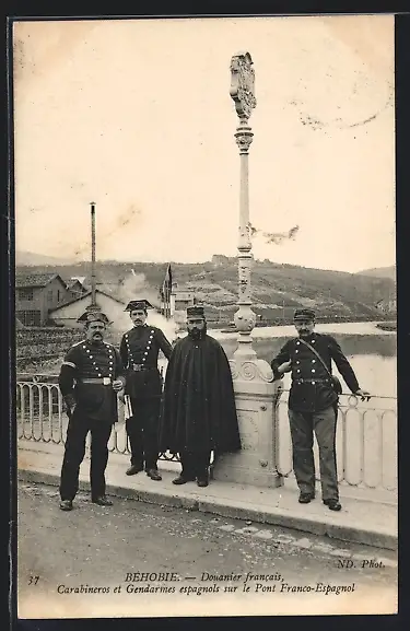 AK Behobie, Duoanier francais, Carabineros et Gendarmes espagnols sur le Pont Franco-Espagnol