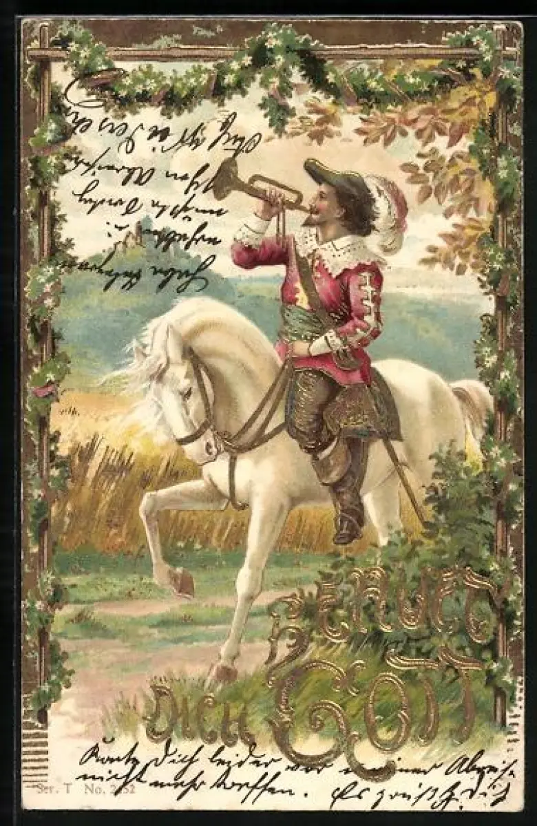 AK Behüt Dich Gott!, Edler Herr mit Trompete reitet auf Schimmel, Goldverzierung