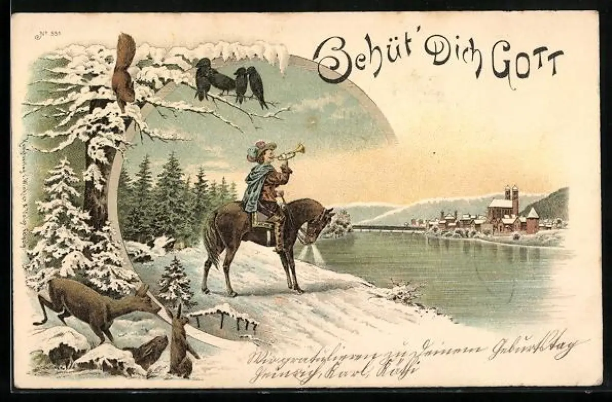 AK Behüt Dich Gott!, Reiter mit Fanfare vor einer Ortschaft im Winter