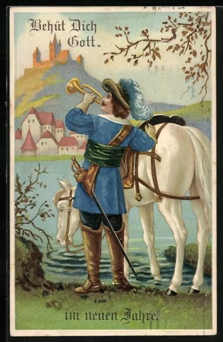 AK Behüt Dich Gott!, Trompeter mit Pferd am Ufer, Neujahrsgruss