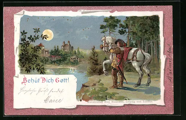 AK Behüt Dich Gott!, Trompeter mit Pferd am Ufer bei Mondschein