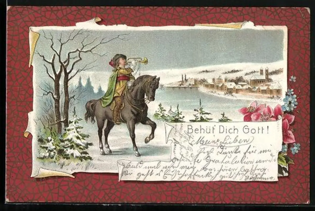 AK Behüt Dich Gott!, Trompeter zu Pferde vor der Stadt im Winter