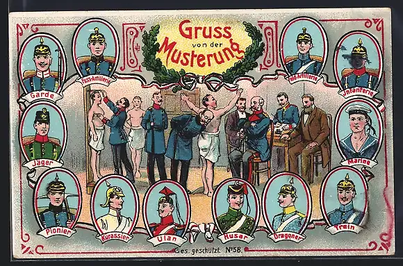 AK Bei der Musterung, Soldatenportraits: Garde, Infanterie, Kurassier, Dragoner etc.