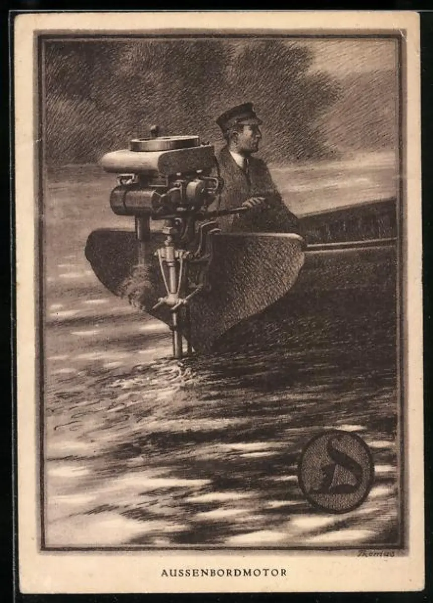 AK Beiboot mit Aussenbordmotor, Werbung für Aussenbordmotoren