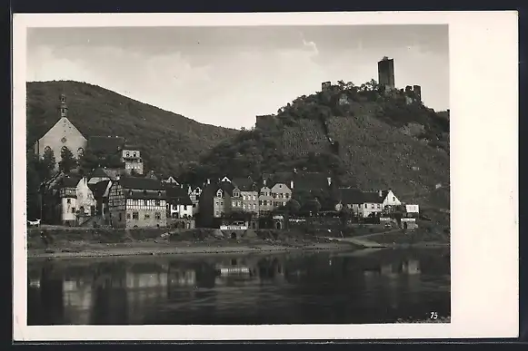 AK Beilstein an der Mosel, Häuser am Moselufer mit Blick hinauf zur Burg