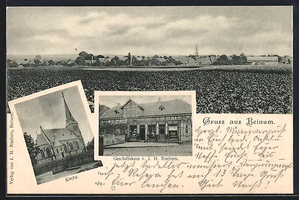 AK Beinum, Geschäft von J. H. Riechers, Kirche und Totalansicht