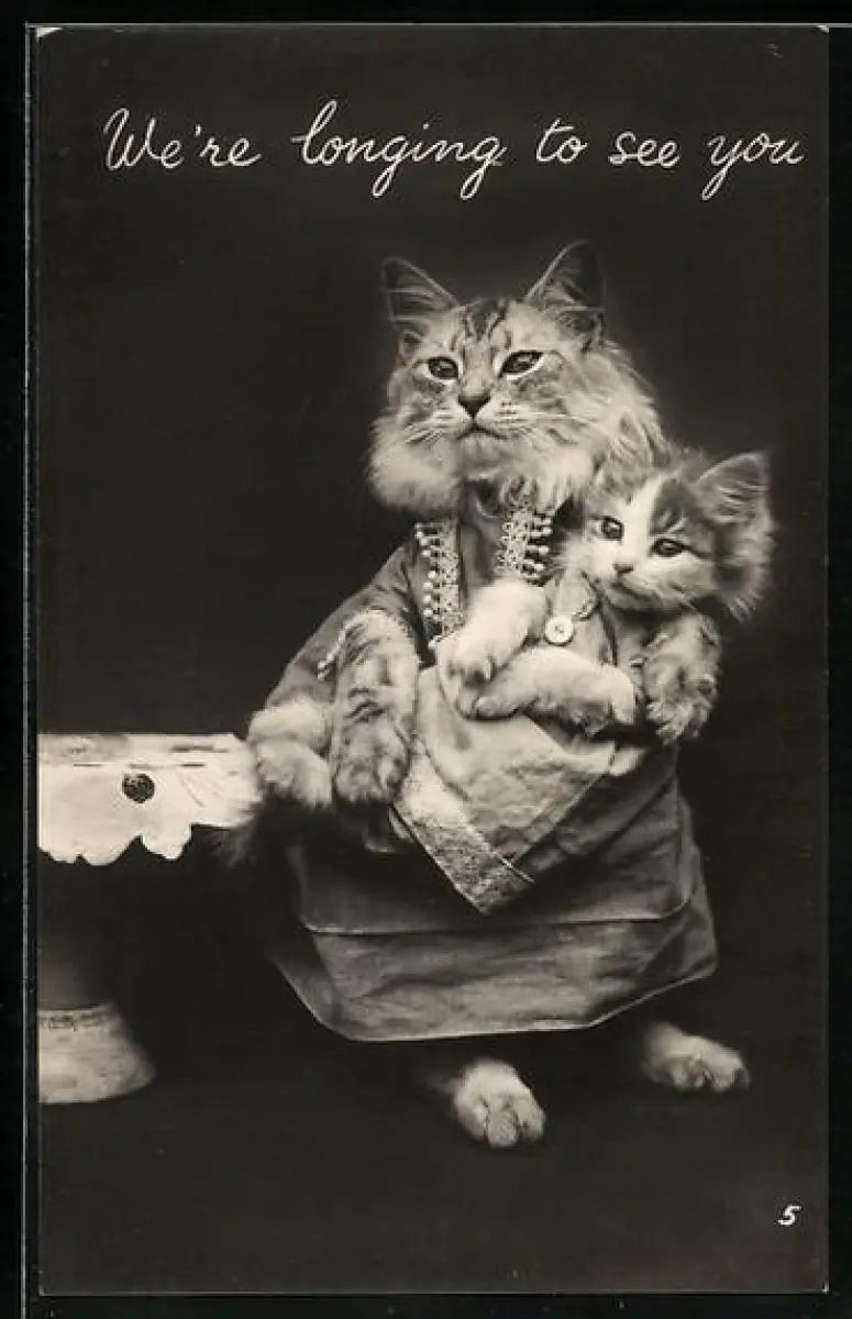 AK Bekleidete Katzenmutter mit bekleidetem Jungen