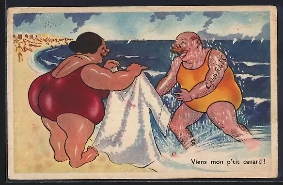 AK Beleibte Dame und kräftiger Herr in Badeanzügen am Strand, Karikatur