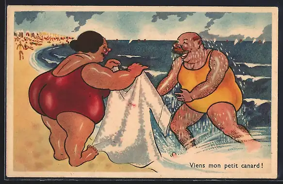 AK Beleibte Dame und kräftiger Herr in Badeanzügen am Strand, Karikatur