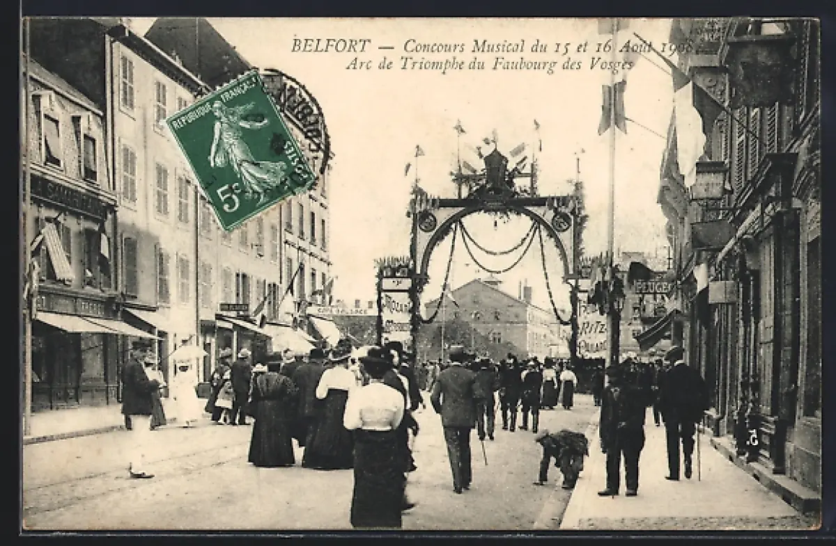 AK Belfort, Arc de Triomphe du Faubourg des Vosges lors du Concours Musical d`août 1908