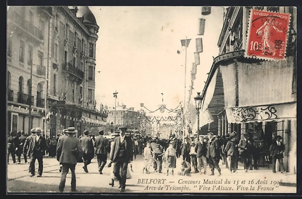 AK Belfort, Concours Musical du 15 et 16 Août 1908, Arcs de Triomphe Vive l`Alsace. Vive la France