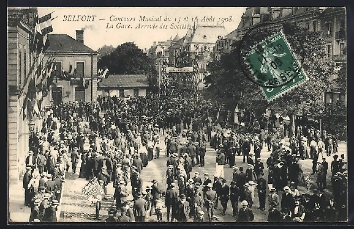 AK Belfort, Concours Musical du 15 et 16 Août 1908, La Gare. Arrivée des Sociétés
