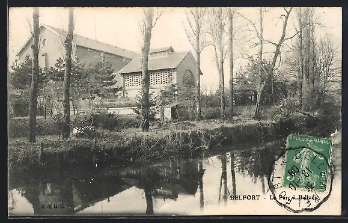 AK Belfort, Le Parc à Belfort avec vue sur l`église et le cours d`eau paisible