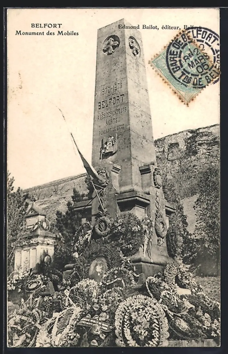 AK Belfort, Monument des Mobiles entouré de couronnes de fleurs