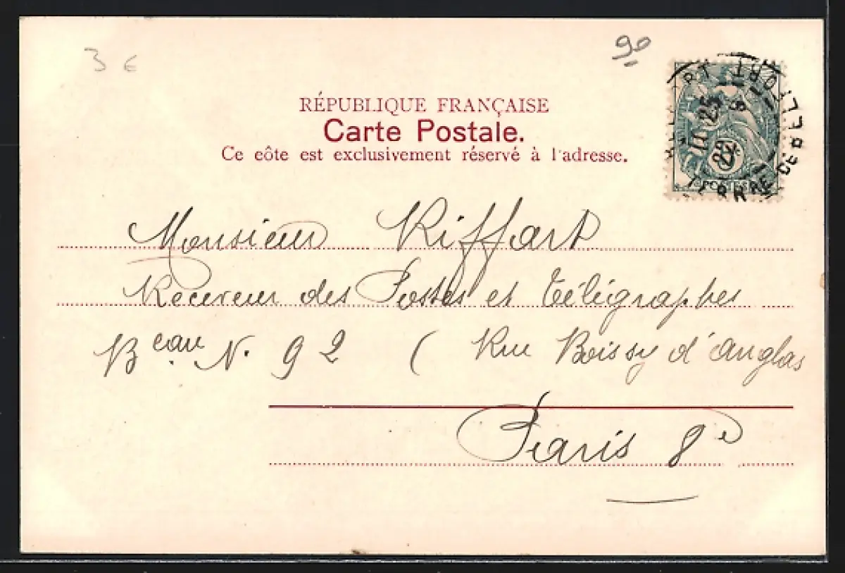 Personenbezogene Daten auf der Rückseite der Karte wurden durch blauen Textmarker unkenntlich gemacht. Die blauen Stellen sind auf die Vorderseite durchgeweicht und wirken sich negativ auf das Postkartenfoto aus
