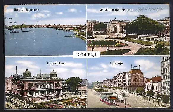 AK Belgrad-Beograd, Vue de Belgrade, La gare, La place Terazia, L`ancien palais royal, Strassenbahn