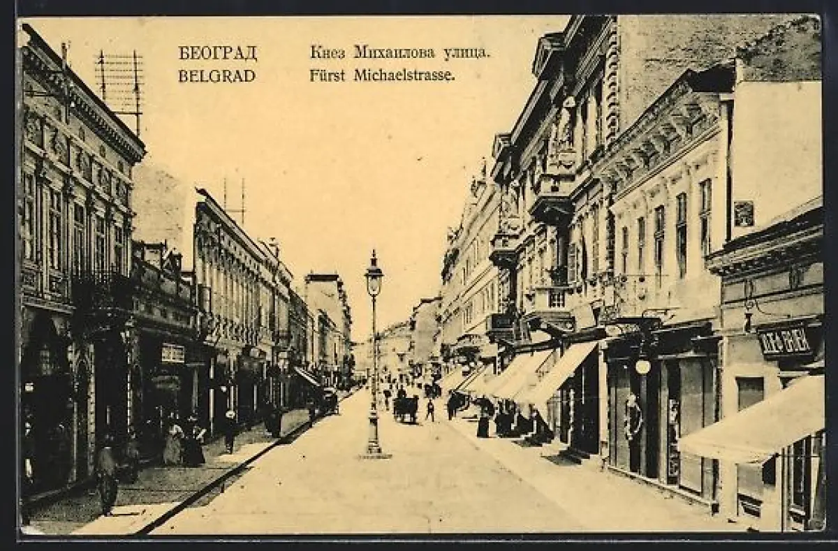 AK Belgrad, Fürst Michaelstrasse, Partie mit Geschäften