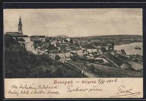 AK Belgrad, Totalansicht mit Wasserblick aus der Vogelschau