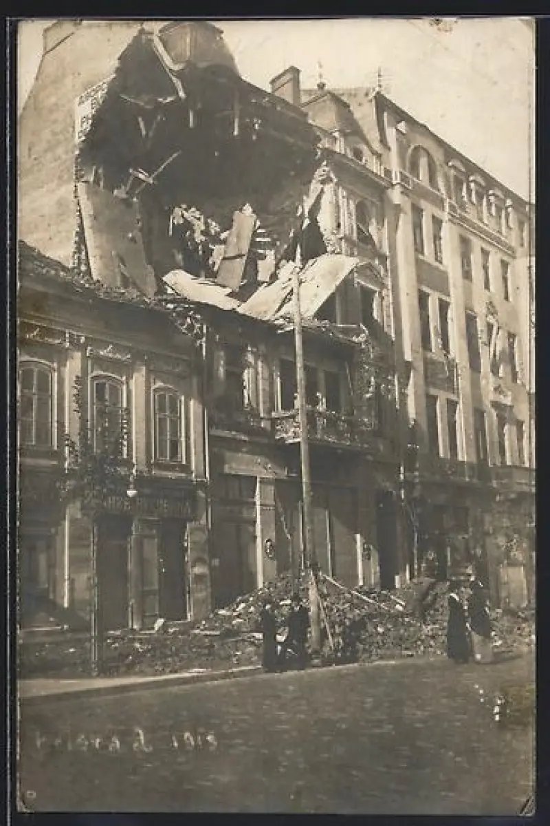 AK Belgrad, Wohn- u. Geschäftsgebäude mit zerstörten oberen Stockwerken, Kriegsschaden
