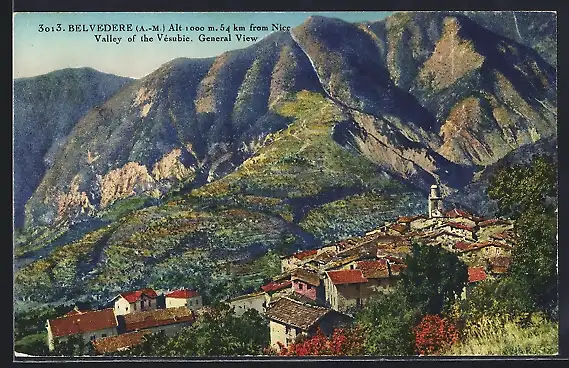 AK Belvédère, Vue générale de la vallée de la Vésubie avec montagnes en arrière-plan