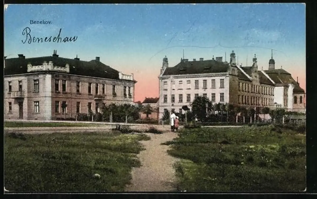 AK Benesov, Ortspanorama mit Ziergiebel-Gebäuden und Turmgebäude