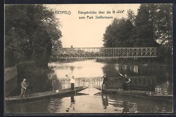 AK Benfeld, Hängebrücke über die Ill zum Park Steffermann, mit Kähnen