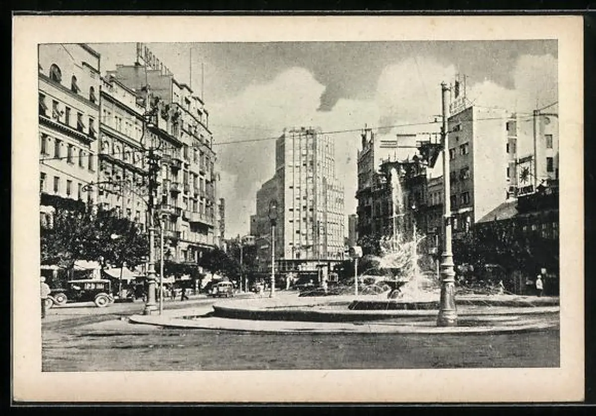 AK Beograd, Terazije, Springbrunnen mit Autos und Hochhäusern