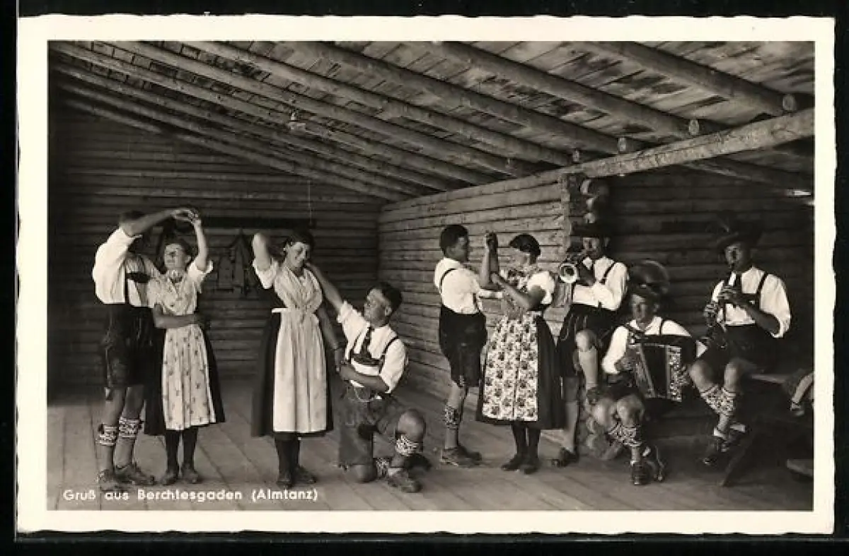 AK Berchtesgaden, Almtanz mit Trompete, Klarinette, Akkordeon