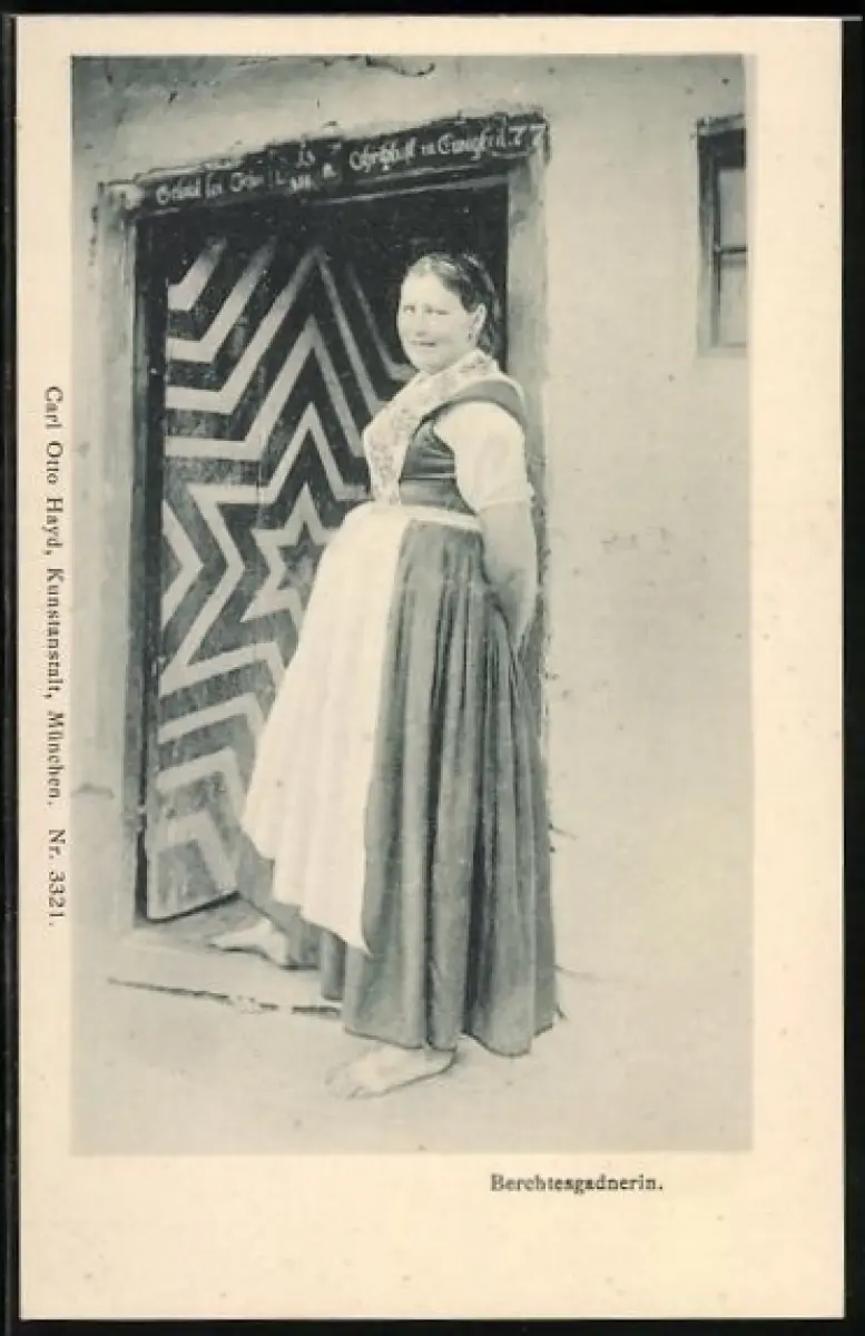 AK Berchtesgaden, Berchtesgadnerin vor einer Haustür, bayerische Tracht