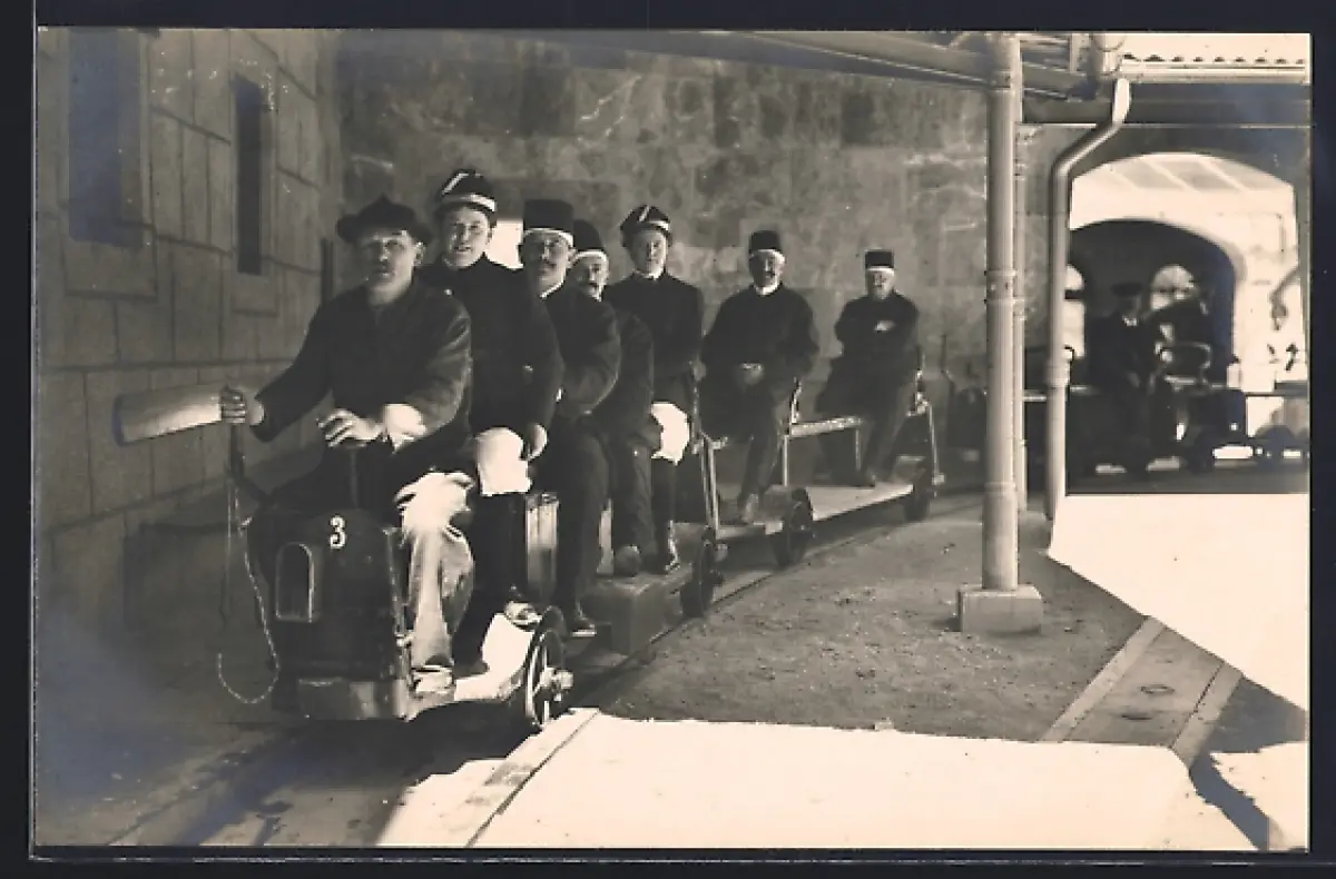 AK Berchtesgaden, Einfahrt in das Bergwerk, Besucher des Salzbergwerks auf der Bergwerksbahn