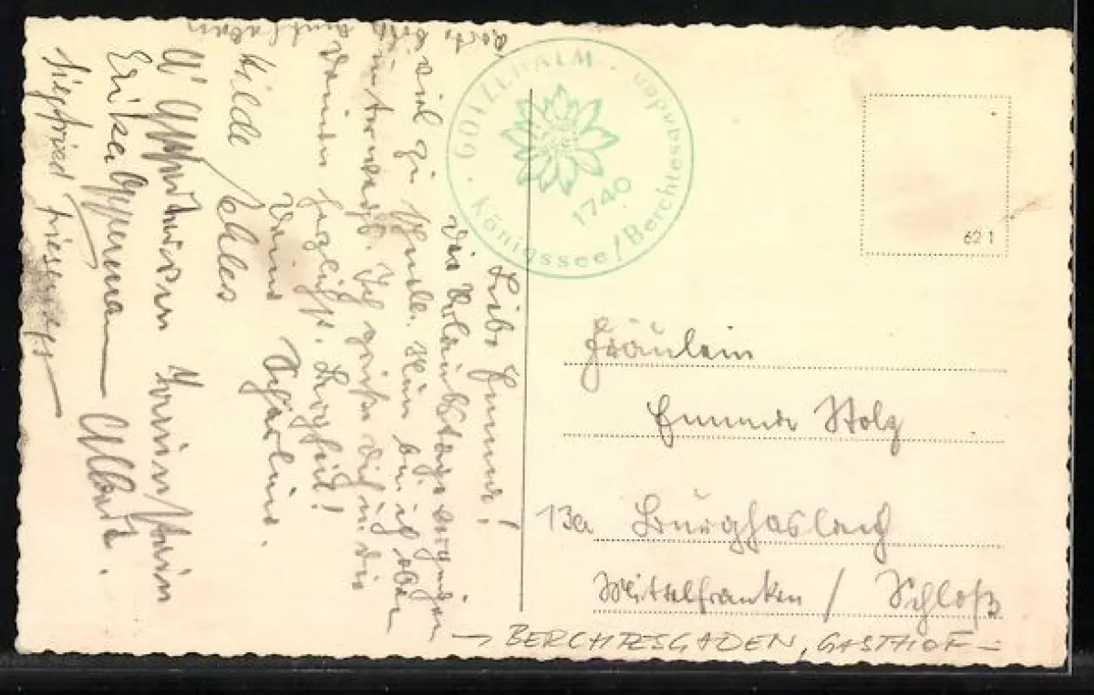 Personenbezogene Daten auf der Rückseite der Karte wurden durch blauen Textmarker unkenntlich gemacht. Die blauen Stellen sind auf die Vorderseite durchgeweicht und wirken sich negativ auf das Postkartenfoto aus