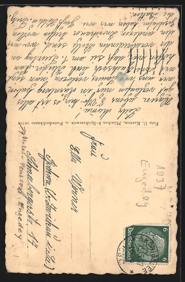 Personenbezogene Daten auf der Rückseite der Karte wurden durch blauen Textmarker unkenntlich gemacht. Die blauen Stellen sind auf die Vorderseite durchgeweicht und wirken sich negativ auf das Postkartenfoto aus