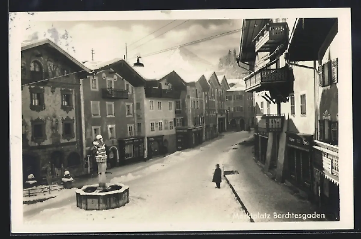 AK Berchtesgaden, Marktplatz mit Brunnen und historischen Häusern im Winter