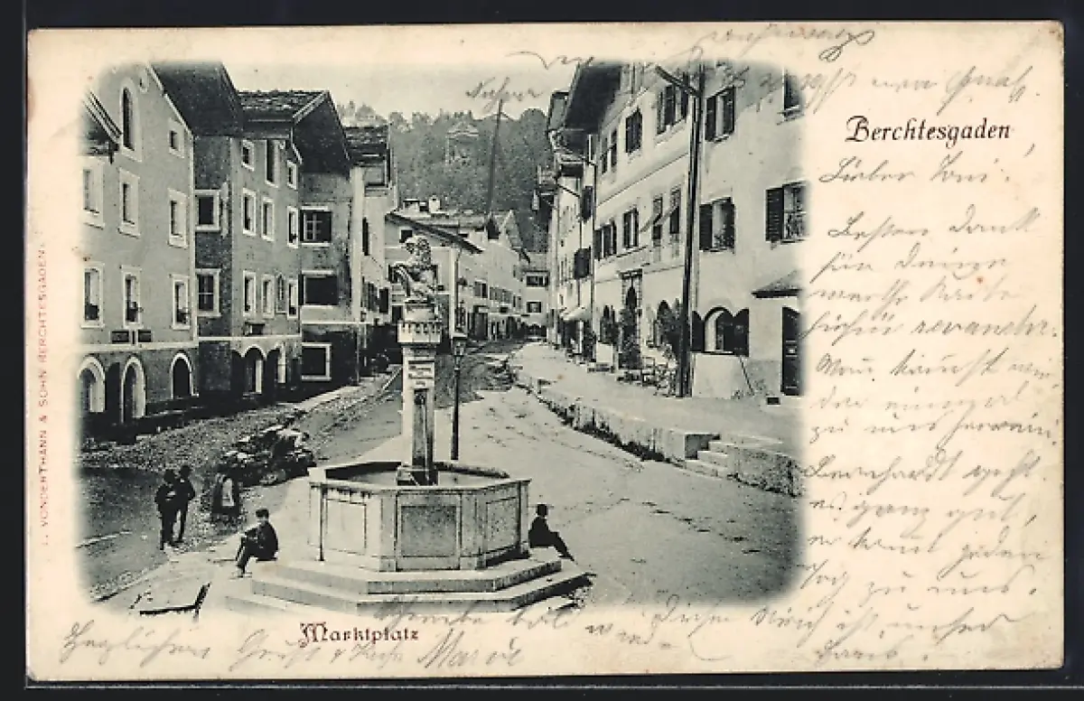 AK Berchtesgaden, Marktplatz mit Brunnen und umliegenden Häusern