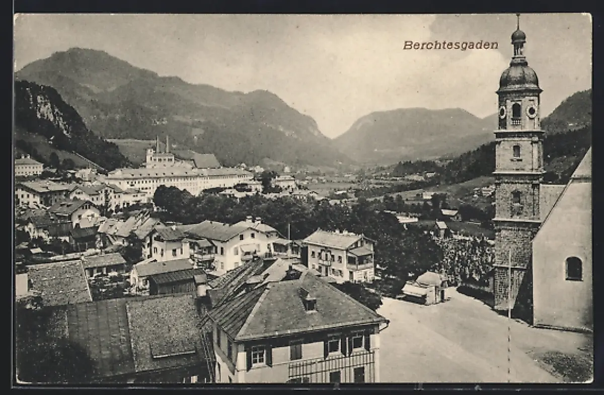AK Berchtesgaden, Ortsansicht mit Kirche und Bergen