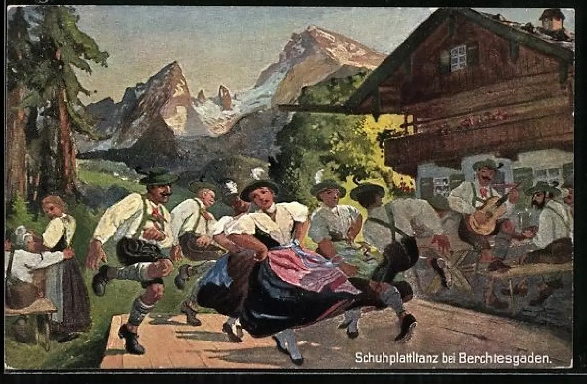 AK Berchtesgaden, Schuhplattlertanz vor Bergkulissse