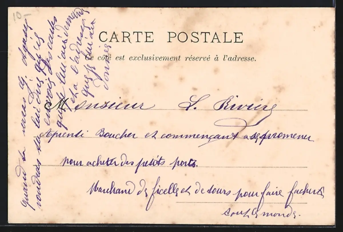 Personenbezogene Daten auf der Rückseite der Karte wurden durch blauen Textmarker unkenntlich gemacht. Die blauen Stellen sind auf die Vorderseite durchgeweicht und wirken sich negativ auf das Postkartenfoto aus
