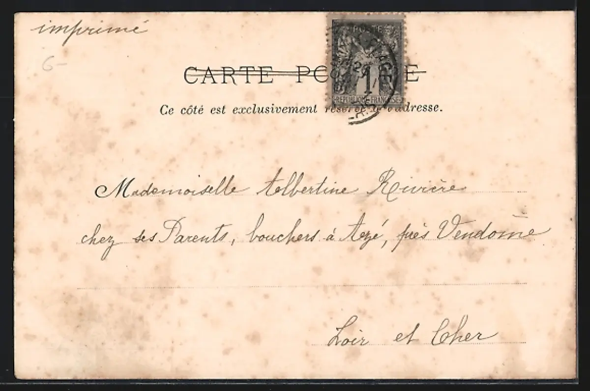 Personenbezogene Daten auf der Rückseite der Karte wurden durch blauen Textmarker unkenntlich gemacht. Die blauen Stellen sind auf die Vorderseite durchgeweicht und wirken sich negativ auf das Postkartenfoto aus