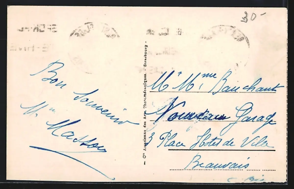 Personenbezogene Daten auf der Rückseite der Karte wurden durch blauen Textmarker unkenntlich gemacht. Die blauen Stellen sind auf die Vorderseite durchgeweicht und wirken sich negativ auf das Postkartenfoto aus