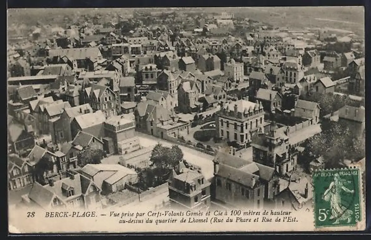 AK Berck-Plage, Vue aérienne du quartier de Lhomel, Rue du Phare et Rue de l`Est, à 100 mètres de hauteur