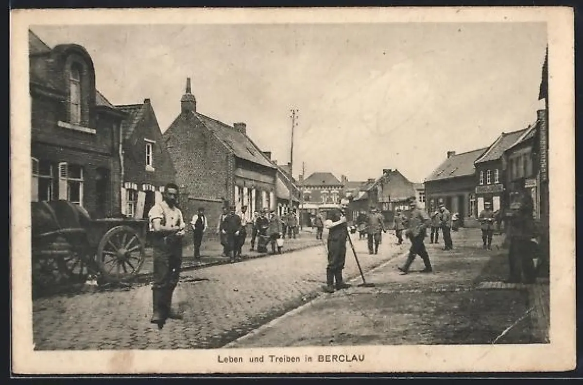 AK Berclau, Scène animée de la rue principale avec passants et charrette